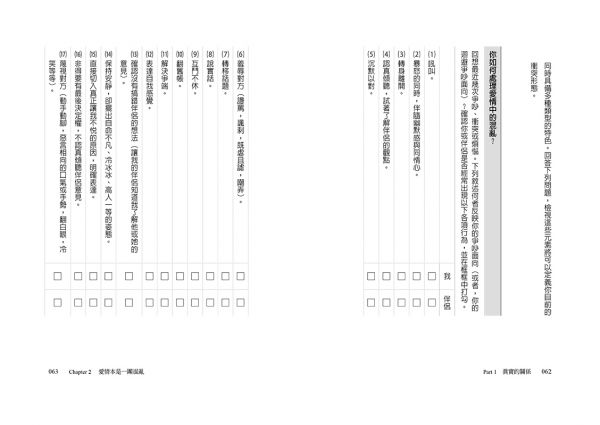 別被這種錯誤的假設搞昏頭,老以為戀愛中的人都應該會讀心術,而且對各種要求無條件服從,這類的對話的重點在於,了解為什麼你,或者你的伴侶要打出這張牌:如果你真的愛我。深度的理解蘊藏在愛的爭論裡,透過爭論找出愛對彼此的意義,以及愛的責任是什麼。你們也許各自懷抱不同觀點,但是,誠實面對可以幫助你對抗重要的情緒路障,提升這分關係的品質。