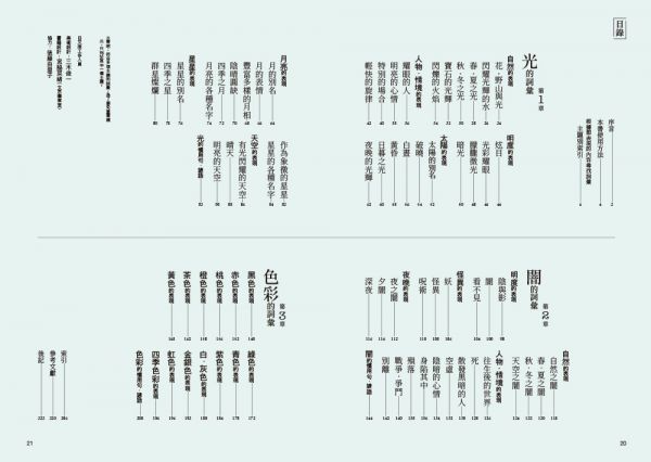 涵蓋明度‧人物‧天體‧季節‧時間‧神妖傳說‧顏色‧花鳥風月等的豐富、獨特、有詩意的詞語,建構出觀看世界的方式,打破線性思考,讓靈感從多方向湧現。