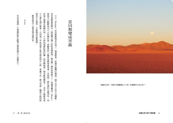 旅遊作家上田莉棋,過去曾在中南美洲的厄瓜多、哥斯大黎加野生動物保育中心擔任志工,也曾前往南非採訪犀牛盜獵問題,並持續關切各種動物議題。為了更深入了解野生動物,也希望更多人了解牠們,她前往非洲進行六個多月的志工之行,陸續在納米比亞、南非及馬拉威三國的動保中心協助。實際站在非洲大地,經歷了一連串出發前未曾預期的震撼教育,透過她的眼睛,我們得以一同看見並理解,物種滅絕的危機絕對是來自於我們人類。