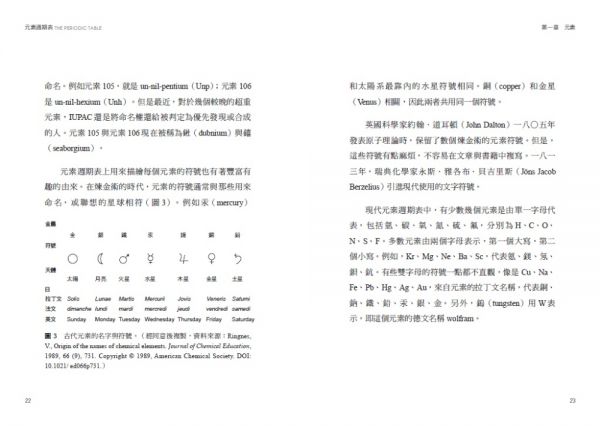 自門得列夫發表週期表後,一百五十多年來有許多人撰文介紹化學領域中最具代表性的系統。然而,唯有艾瑞克‧希瑞能以如此簡明扼要的方式,介紹元素週期表的來源、意義與最新發展。