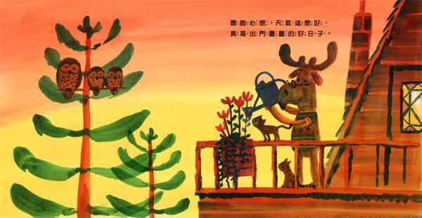 麋鹿背著畫具出門了,他想找一片美麗的風景寫生;