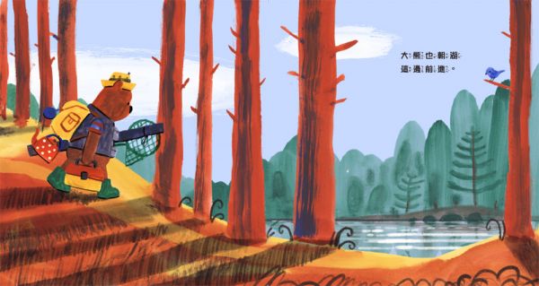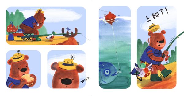 另一邊,大熊準備好釣具和午餐,在湖邊找到釣竿架開始釣魚。