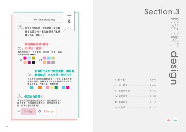A:顏色數量超過5種時,必須統一色調!也可利用對比來取代顏色數量,或改用白色背景,都是解決問題的好方法。