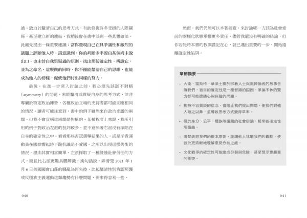 簡短的答案是:人們必須少一點確定性;換句話說,我們得避開我稱為確定性陷阱的危機。而且在各種情況都適用,無論你是擔心極右翼接管掌權,或覺醒革命(woke revolution)爆發;關心氣候變遷,或憂慮政府過度管制;警覺到白人身分認同主義(white identitarianism)的浪潮,或為邊境移民潮而憂心。我並不期待讀者們馬上相信我的說法,確實,每當我談論確定性所帶來的危險與確定性陷阱的概念時,有人會跟我說,多質疑自己一點、少評判他人,也許是種有趣的智識練習,卻無法解決現實世界的問題,彷彿這兩個目標水火不容。