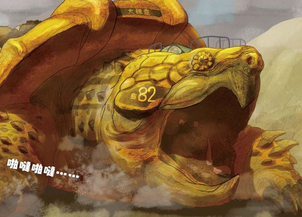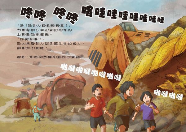 大白鯊張開血盆大口,箱魨貨櫃一個接一個被吞進吐出;非洲象揮舞象牙猛力挖土,長鼻噴出水柱壓制飛塵;河馬推土車用巨大身軀推開土石;大蜈蚣用好多隻腳踩出震動,把地面壓得平整光滑;海象的兩根長牙像電鑽般旋轉鑽洞,一根根打下地樁!