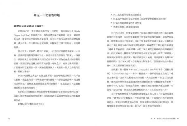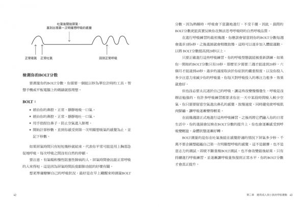 你可以在這本書裡找到你所需要的一切,來理解呼吸是如何影響你的健康。書中內含二十六種呼吸練習,全都有不同用途:從重新訓練呼吸,阻止恐慌症發作,為提案或競賽做好準備,改善睡眠品質,讓身體暴露在好的壓力下,到對抗壞的壓力,應有盡有。別擔心,你不需要全部都學會。只要挑出一或兩種呼吸練習,好好練習,然後再回頭去學會更多呼吸練習就行了。你將會學到如何幫自己進行身體氧氣含量測試(Body Oxygen Level Test,以下簡稱BOLT),評估自身的呼吸健康狀態,才能挑選出最適合自己的計畫。