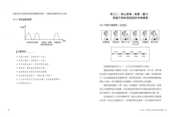 這本書會引導你逐一探索對健康呼吸和健康生活至關重要的技巧。我的目標是讓你能為自身健康負起責任,預防和大幅減少一些常見疾病,幫助你瞭解自己的潛能,提供以科學為基礎的簡單方法來改變你的呼吸習慣。只要每日練習,你會發現體力變好了,注意力更集中了,也更能面對和處理壓力,得到更好的生活品質。