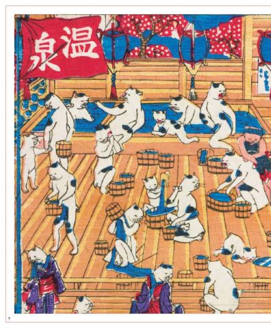 除了芳藤,其他較常見的玩具繪畫師還有歌川國利。「玩具繪」裡面的貓,大多是具有七情六欲、擬人化的貓,然而在這樣的主流趨勢下,類似《志板貓百態》(P.106)裡那些回歸動物原形的貓,還是頻頻出現在國利的作品中。雖然那些被套「紙袋」、舔毛之類的動作,看似描繪得自然流暢,不過這些實則多半臨摹自歌川廣重的畫本。