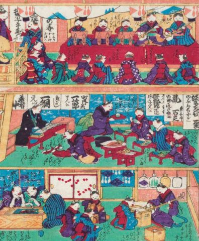 此外,國芳更發揮天生的調皮玩心,把貓的各種姿態組合起來,繪製成文字或和服的紋樣。即便是怪談中的妖怪「貓又」,也頭戴手巾、手舞足蹈,顯露出可愛逗趣的一面。另外,國芳也有許多不用「貓妝容」,而用「貓肖像」手法繪製人氣歌舞伎演員的畫作,或是以貓擬人的畫作,這些作品都博得極大好評。這種把貓擬人化的畫風,後來更為明治時期的玩具繪傳承下來。