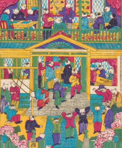 裝飾了注連繩(把祭神場所和其他場所區隔的稻草繩,新年時懸掛在家戶門前或神壇)、門松,洋溢著新年的氣氛。舞獅隊挨家挨戶踩街賀歲,伴著笛子和太鼓的樂聲,舞動祥獅獻瑞。畫中扮獅子的貓正脫下舞獅裝,稍事休息。