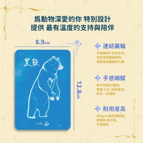 ✦這副牌卡的功能不是占卜,而是透過提問、抽牌、文字訊息、動物的力量,幫助我們釐清困惑,面對不安,走過徬徨,撫慰離別的震盪。