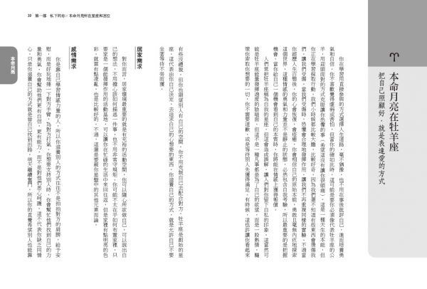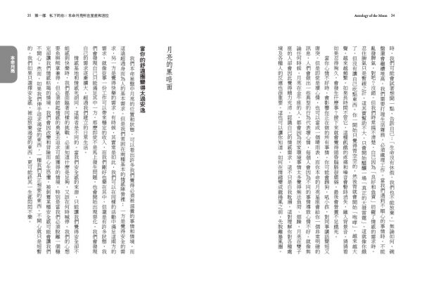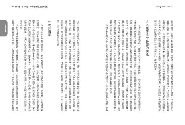 通俗占星學喜歡用描述性的字眼,像是形容牡羊座「大膽」、「果決」和「霸道」,或是形容處女座「井然有序」、「務實」和「挑剔」。如果你認識一團亂的處女座或客氣有禮的牡羊座,請舉手! 善用占星學的最佳方式並不是分門別類,而是提出指引和應對之道。我們如果不要以「自己目前狀態」為出發點,而是用「正要變成的模樣」看待自己的星盤,就能開啟對星盤的全面理解。星盤就像我們的處方籤,建議我們如何活出更充實的人生。你的本命星盤是你最重要的工具,當你知道如何正確利用它時,它就能在你身上發揮更好的效果。這本書會教導你如何使用這個工具中的一個重要元素:月亮。我不只會列出每個月亮星座的性格特質,還會提供你一個範疇,告訴你會在哪個範圍的經驗和課題中遊走,體驗生命,而這都取決於你的選擇。因此,你可以把你的星盤想像成一張地圖,當你在吸收個人經驗時,當你在琢磨理解人生的方向時,月亮就像指南針,指引你航渡大海,時而風平浪靜,時而波濤洶湧,穿越不同的國度,無論熟悉或陌生都能跨步向前。