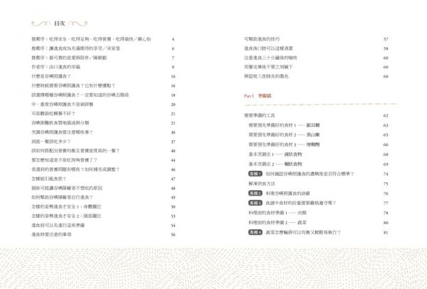 用天然食材製作吞嚥照護食,被照顧者吃了多少可以一目瞭然,方便家人根據身體變化調整營養需求。書中並提供針對高齡吞嚥困難者的營養比例,以及熱量需求的建議,並有如何檢測是否營養不良的方法。