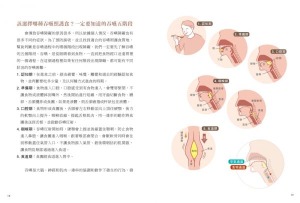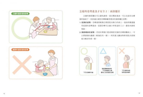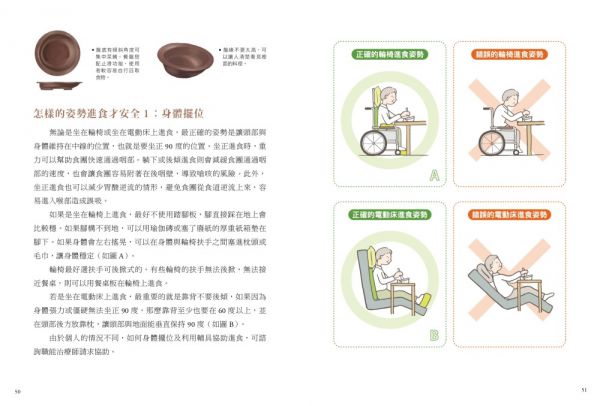 協助被照顧者自行進餐的姿勢擺位及餐具建議、需餵食者的餵食技巧、餐前幫助吞嚥的運動、餐後口腔照護的方法,全部圖解說明,一次到位。