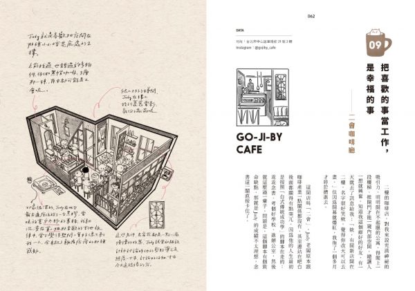 這次挑選了38間Ker Ker心中的寶藏店,可能不是最新、最好拍或最有話題,多半是一人店,或由情侶夫妻一起經營的獨立小店。第一手採訪老闆們的創業血淚,浪漫與現實交織的真心話,對於咖啡、空間及經營的想法。佐以精細的手繪透視插圖和氛圍感滿滿的照片,為每間咖啡店留下各種可愛的空間細節。