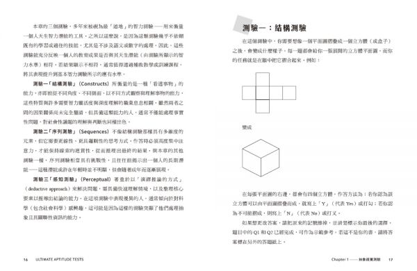 這是一本能激發挑戰心的書。它非常適合面試前練習,也能提升整體能力。超越傳統的填字遊戲與謎題,能有效訓練大腦。題目精心設計且充滿策略性,讓我一邊答題一邊訓練反應速度。每章節開頭都有題型示範與建議作答時間,可以依照書中指示進行,也能按照自己的節奏作答。這本書可以測驗能力極限。——英國讀者Ben Hull