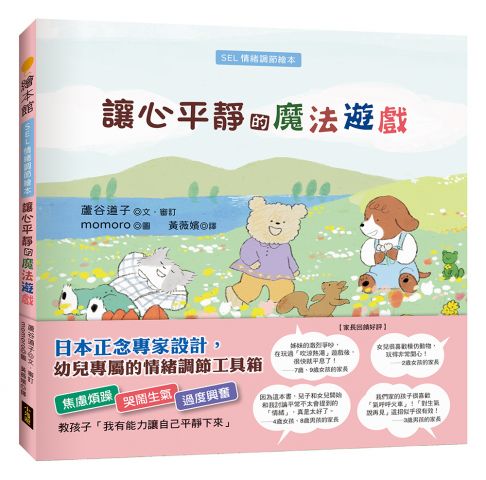 本書由日本正念教育專家、滋賀大學教授蘆谷道子博士撰寫,針對幼兒常見的三種情緒困擾「焦慮煩躁」、「哭鬧生氣」、「過度興奮」,設計9款正念遊戲。每個遊戲都搭配「給家長的建議」,說明遊戲原理、引導技巧和變化玩法,讓家長輕鬆上手,承為孩子最好的情緒教練。