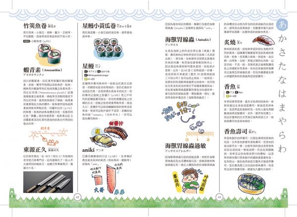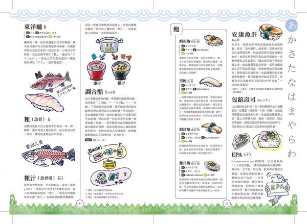 什麼是「親方」、「鮮度君」、「女郎壽司」?握壽司、押壽司、太卷壽司之間有什麼不同?這些令人好奇的「壽司語」,都可以在這本書裡找到。