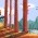 森林裡,太陽緩緩升起,湖面閃著金色光芒。